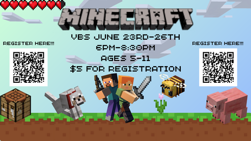 Join us for a Minecraft-themed Vacation Bible School June 23rd–26th, from 6:00–8:30 PM, for an epic adventure where kids (ages 5–11) will dig into God's Word, worship together, build crafts, and enjoy tasty snacks! Each night includes exciting lessons, hands-on fun, and many Minecraft-inspired surprises.